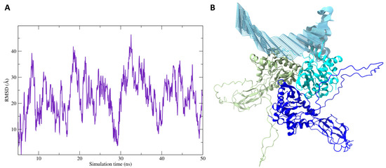 A quantitative measure of flexibility and the magnitudes of molecular motions in the N-terminal region were obtained by 50 ns of molecular dynamics simulation. The molecular dynamics simulation used as a starting point one of the cluster centers from the docking step. Molecular graphics software Visual Molecular Dynamics (VMD) [48] and UCSF Chimera [49] were used to generate coordinate and protein structure (.psf) files applying the atom types and connectivity definitions of the CHARMM36m force field [50]. The system was set up in a way that the ionization states of the amino acid side chains mimicked the pH~7 condition, and the δ-N of the histidine imidazole ring was protonated (HSD residue). This was set up by the PROPKA algorithm [46] already in the docking workflow. The starting structure for hE2o was not the published 6H05 [21] structure alone, due to the missing LDo, but the trimeric hE2o core of the 6H05 structure and the respective Alphafold structure superimposed, which showed an overall RMSD of 1.195 Å.