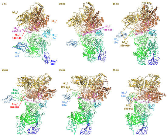 Selected time points along the MD simulation of the subcomplex built from a hE1a dimer and hE2o trimer illustrating the motions of an unbound LDo. In this figure, the hE2o trimer has an LDo bound to hE1a (hE2o2 LDo), whereas another LDo migrates towards hE1a. Notable regions are the region of the hE1a linker domain (485–518), which will have interactions with two hE2o monomers, hE1a 140–148 (similar to hE1o 188–196) in the N-terminal region, which will interact with hE2o 78–145. The C-terminal region of hE1a is, in part of the time, proximal to the N-terminal region of hE2o, which also explains the observed cross-links between them. hE1a residues 899–919 (955–975 in hE1o) appear to play a—yet unrevealed—role in the subunit dynamics of this subcomplex.