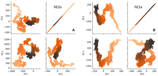 PCA projections of the first three principal components for the hE2o (A) and hE1a (B) trajectories. The color scale is according to the simulation time, with deeper oranges belonging to more advanced time points. Conformational changes could be followed in time for all the components of the system.