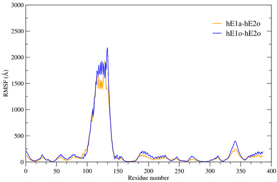 To gain more insight into the interactions of hE1o-hE2o and hE1a-hE2o, the residue-level dynamics was evaluated as averaged root-mean-square fluctuations (RMSF) for the backbone atoms in hE1o and hE1a. This revealed greater flexibility (higher RMSF values) for the respective N-terminal regions, the interdomain linker regions that connect the respective two halves of the hE1 subunits [19,20], and for residues in the corresponding α/β2 domains involved in binding the ThDP cofactors (Figure S3). The RMSF plots indicated that, on interaction with hE1o or hE1a, the hE2o linker region exhibited higher RMSF values compared to other regions of hE2o (Figure 6). This high relative flexibility also shows the importance of the hE2o linker region for the stability and function of the implicated enzyme complexes: The maintained flexibility ensures the possibility of interaction with all the respective components of the overall complexes.