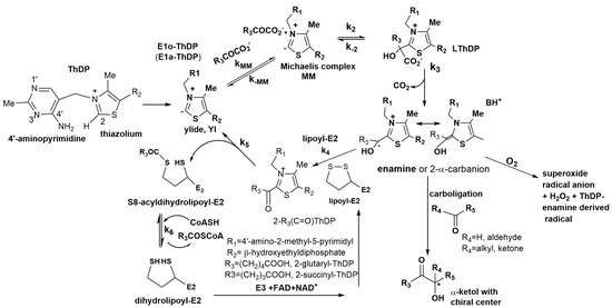 - Nemeria, N.S.; Ambrus, A.; Patel, H.; Gerfen, G.; Adam-Vizi, V.; Tretter, L.; Zhou, J.; Wang, J.; Jordan, F. Human 2-oxoglutarate dehydrogenase complex E1 component forms a thiamin-derived radical by aerobic oxidation of the enamine intermediate. J. Biol. Chem. 2014, 289, 29859–29873. [Google Scholar] [CrossRef]