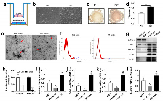 Effects of skeletal muscle-derived exosomes on adipogenesis in 3T3-L1 cells. (a) C2C12 cells were co-cultured with 3T3-L1 cells, and the cells were grown in a transwell. (b) The morphology of C2C12 cells before and after differentiation was observed under a microscope (scale bar = 100 μm). (c) During co-culture, differentiated 3T3-L1 adipogenic precursor cells were induced to mature, and oil red O staining was performed. (d) During co-culture, the differentiation of 3T3-L1 adipocyte precursor cells was induced to mature to examine TG content (n = 6). (e) Electron microscopy photographs of C2C12 cells-derived exosomes proliferation (Pro-Exos) and differentiation (Diff-Exos) (scale bar = 200 nm). (f) Nanoparticle tracking analysis (NTA) was used to determine the size distribution and concentration of exosomes. (g) Marker proteins Alix, TSG101, CD9, and CD63 in exosomes extracted from C2C12 cells, and the Western Blot detection bands of endoplasmic reticulum marker protein Calnexin. (h) The expression of miR-146a-5p in C2C12 cells proliferation and differentiation (n = 6), and the expression of miR-146a-5p in C2C12 cells-derived exosomes of the proliferation and differentiation (n = 4). (i–l) After treatment with skeletal muscle-derived exosomes (Pro-Exos, Diff-Exos), adipogenesis-related genes PPARγ and C/EBPα, and fatty acid synthesis-related genes CD36 and FABP4, were detected by real-time quantitative PCR after induced differentiation in 3T3-L1 preadipocytes (n = 6). Values are presented as means ± SEM, * p < 0.05, and ** p < 0.01, according to the non-paired Student’s t-test or one-way ANOVA between individual groups. Different letters mean significant difference (p < 0.05), and the same letters mean no significant difference (p > 0.05).
