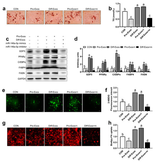 miR-146a-5p reversed the effect of skeletal muscle-derived exosomes on adipogenesis, glucose uptake, and fatty acid absorption in 3T3-L1 cells. (a) After treatment of exosomes (Pro-Exos, Diff-Exos) and transfections of miR-146a-5p mimics and miR-146a-5p inhibitor, 3T3-L1 adipogenic precursor cells were induced to mature, and oil red O staining was performed (scale bar = 50 μm). (b) After treatment with exosomes (Pro-Exos, Diff-Exos) and transfecting miR-146a-5p mimics (mimics) and miR-146a-5p inhibitor (inhibitor), 3T3-L1 adipocytes were induced to mature, and TG content was assayed (n = 6). (c,d) After treatment of exosomes (Pro-Exos, Diff-Exos) and transfections of mimics and inhibitor, adipogenesis-related proteins and fatty acid synthesis-related protein bands were detected by Western Blot in mature 3T3-L1 cells (n = 4). (e) 2-NBDG fluorescence profile of 3T3-L1 cells after treatment of exosomes (Pro-Exos, Diff-Exos) and transfections of mimics and inhibitor for 24 h (scale bar = 50 μm). (f) 2-NBDG fluorescence values of 3T3-L1 cell after treatment of exosomes (Pro-Exos, Diff-Exos) and transfections of mimics and inhibitor for 24h (n = 6). (g) Bodipy-FA fluorescence image of 3T3-L1 cells after treatment with exosomes (Pro-Exos, Diff-Exos) and transfections of mimics and inhibitor for 24 h (scale bar = 50 μm). (h) Bodipy-FA for 4 h, 3T3-L1 cell fluorescence values after treatment of exosomes (Pro-Exos, Diff-Exos) and transfections of mimics and inhibitor for 24 h (n = 6). Values are presented as means ± SEM, according to the non-paired Student’s t-test or one-way ANOVA between individual groups. Different letters mean significant difference (p < 0.05), and the same letters mean no significant difference (p > 0.05).