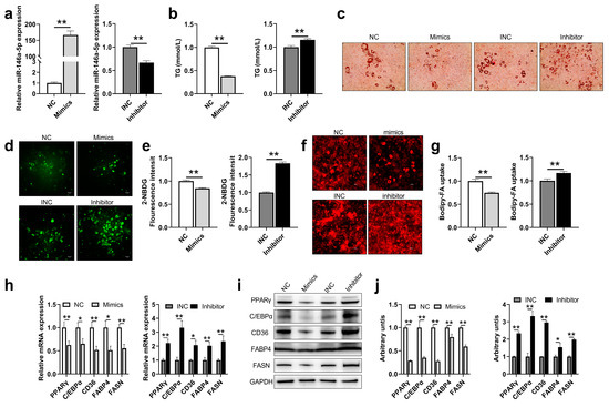 miR-146a-5p was associated with adipogenesis and glucose uptake and fatty acid absorption. (a) miR-146a-5p gene expressions in 3T3-L1 adipose mature cells after transfections of miR-146a-5p mimics (Mimics) and miR-146a-5p inhibitor (Inhibitor) (n = 6). (b) TG content in 3T3-L1 adipose mature cells after transfections of mimics and inhibitor (n = 6). (c) Oil red O staining photographs in 3T3-L1 adipose mature cells after transfections of mimics and inhibitor (scale bar = 50 μm). (d) Fluorescence image of 3T3-L1 cells treated with glucose analog 2-NBDG for 1 h after transfections of mimics and inhibitor for 24 h (bar = 50 μm). (e) Statistical graph of fluorescence value of 3T3-L1 cells treated with glucose analog 2-NBDG (n = 4). (f) Fluorescence image of 3T3-L1 cells treated with free fatty acid analog Bodipy-FA for 4 h after transfections of mimics and inhibitor for 24 h (bar = 50 μm). (g) Statistical graph of fluorescence value of 3T3-L1 cells treated with free fatty acid analog Bodipy-FA (n = 4). (h) After transfection of mimics and inhibitor adipogenesis-related genes PPARγ, C/EBPα, and fatty acid synthesis-related genes CD36, FABP4, and FASN were detected by real-time quantitative PCR in mature 3T3-L1 (n = 6). (i,j) After transfection of mimics and inhibitor, adipogenesis-related proteins PPARγ, C/EBPα, and fatty acid synthesis-related proteins CD36, FABP4, and FASN were detected by Western Blot (n = 6). Values are presented as means ± SEM, * p < 0.05, and ** p < 0.01, according to the non-paired Student’s t-test or one-way ANOVA between individual groups.