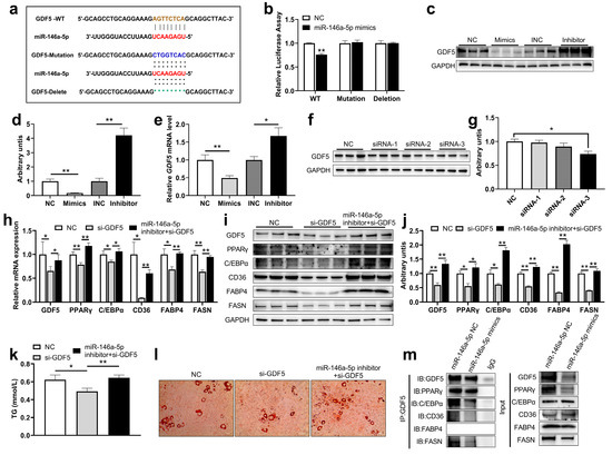 miR-146a-5p regulated PPARγ signaling pathway by targeting GDF5. (a) miR-146a-5p has a target interaction with the 3′UTR of GDF5. (b) Statistical chart of miR-146a-5p and GDF5 dual luciferase validation fluorescence values (n = 8). (c,d) After transfections of miR-146a-5p mimics (Mimics) and miR-146a-5p inhibitor (Inhibitor), GDF5 was detected by Western Blot in mature 3T3-L1 cells (n = 6). (e) After transfections of mimics and inhibitor, GDF5 gene expression was detected by real-time quantitative PCR (n = 6). (f,g) 3T3-L1 cells were transfected with GDF5 siRNA for 48 h, and GDF5 was detected by Western Blot (n = 6). (h) After transfection (NC, GDF5 siRNA, miR-146a-5p inhibitor + GDF5 siRNA), GDF5, PPARγ C/EBPα, CD36, FABP4 and FASN expressions were detected by real-time quantitative PCR (n = 6). (i,j) After transfection (NC, GDF5 siRNA, miR-146a-5p inhibitor + GDF5 siRNA), proteins GDF5, PPARγ C/EBPα, CD36, FABP4 and FASN were detected by Western Blot (n = 6). (k) After transfection (NC, GDF5 siRNA, miR-146a-5p inhibitor + GDF5 siRNA), TG content was assayed (n = 6). (l) After transfection (NC, GDF5 siRNA, miR-146a-5p inhibitor + GDF5 siRNA), oil red O staining was performed (scale bar = 50 μm). (k) Oil Red O readings (n = 6). (m) Immunoprecipitation assay revealed enrichment of PPARγ C/EBPα, CD36, FABP4, and FASN when introduced with GDF5. Values are presented as means ± SEM, * p < 0.05, and ** p < 0.01, according to the non-paired Student’s t-test or one-way ANOVA between individual groups.