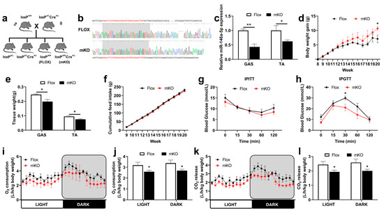 Regulations of growth and metabolism in transgenic mice. (a) Mice breeding atlas. (b) Sequence alignment of skeletal muscle-specific miR-146a-5p knockout (mKO) and Flox. (c) The expression of miR-146a-5p in GAS and TA of mKO mice was detected by quantitative PCR (n = 4). (d) Body weight change curve of Flox and mKO mice fed a high-fat diet (n = 4). (e) The muscle weight for GAS and TA of Flox and mKO mice fed a high-fat diet (n = 4). (f) Accumulate feed intake of Flox and mKO fed HFD (n = 4). (g) IPITT blood glucose changes in Flox and mKO mice (n = 4). (h) IPGTT blood glucose changes in Flox and mKO mice (n = 4). (i,j) Oxygen consumption (n = 4). (k,l) CO2 release (n = 4). Values are presented as means ± SEM, * p < 0.05, and ** p < 0.01, according to the non-paired Student’s t-test or one-way ANOVA between individual groups.