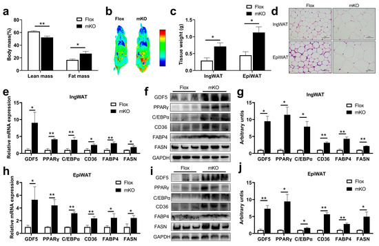 Effects of skeletal muscle-specific miR-146a-5p knockout on adipogenesis in mice. (a) Body composition of Flox and mKO mice. (b) Body imaging of Flox and mKO mice. (c) Tissue weight (IngWAT and EpiWAT) of Flox and mKO mice after feeding with a high-fat diet (HFD) (n = 4). (d) HE staining image of IngWAT and EpiWAT in Flox and mKO mice fed with HFD (scale bar = 50 μm). (e) Fluorescence quantitative PCR detection of adipogenesis-related genes GDF5, PPARγ, C/EBPα, and fatty acid synthesis-related genes CD36, FABP4, FASN in IngWAT of Flox and mKO mice (n = 4). (f,g) Western Blot detection of adipogenesis-related proteins GDF5, PPARγ, C/EBPα, and fatty acid synthesis-related proteins CD36, FABP4, and FASN in IngWAT of Flox and mKO mice (n = 4). (h) Fluorescence quantitative PCR detection of adipogenesis-related genes GDF5, PPARγ, C/EBPα, and fatty acid synthesis-related genes CD36, FABP4, FASN in EpiWAT of Flox and mKO mice (n = 4). (i,j) Western Blot detection of adipogenesis-related proteins GDF5, PPARγ, C/EBPα, and fatty acid synthesis-related proteins CD36, FABP4, FASN in EpiWAT of Flox and mKO mice (n = 4). Values are presented as means ± SEM, * p < 0.05, and ** p < 0.01, according to the non-paired Student’s t-test or one-way ANOVA between individual groups.
