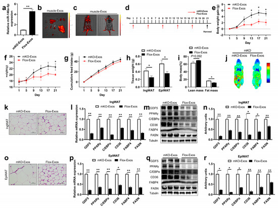 The intravenous injection of Flox-Exos into mKO mice reversed the inhibition of adipogenesis. (a) Expressions of miR-146a-5p were determined in skeletal muscle-derived exosomes from mKO and Flox mice (n = 6). (b) The fluorescence signal of skeletal muscle-derived exosomes in isolated mKO mice organs 24 h after tail vein injection. The isolated organs from left to right are as follows: heart, liver, spleen, lung, kidney, BAT, IngWAT, EpiWAT, whole intestine, TA, EDL, GAS, SOL. (c) In vivo imaging of mKO mice 24h after tail vein injection of PKH67-labeled skeletal muscle-derived exosomes. (d) Schematic diagram of tail-vein injections of Flox-Exos and mKO-Exos administered to HFD-fed mKO mice at the age of 6 weeks. (e) Body weight gain in mKO mice (n = 3). (f) Body weight of mKO mice (n = 3). (g) Accumulate feed intake of mKO mice fed HFD (n = 3). (h) Tissue weight (IngWAT and EpiWAT) of mKO mice (n = 3). (i) Body Composition of mKO mice (n = 3). (j) Body imaging of mKO mice. (k) IngWAT HE staining image of mKO mice. (l) Expression of adipogenesis and fatty acid synthesis-related genes 21 days after exosome injection in IngWAT (n = 3). (m,n) Expression of adipogenesis and fatty acid synthesis-related proteins in IngWAT (n = 3). (o) EpiWAT HE staining image of mKO mice. (p) Expression of adipogenesis and fatty acid synthesis-related genes 21 days after exosome injection in EpiWAT (n = 3). (q,r) Expression of adipogenesis and fatty acid synthesis-related proteins in EpiWAT (n = 3). Values are presented as means ± SEM, * p < 0.05, and ** p < 0.01, according to the non-paired Student’s t-test or one-way ANOVA between individual groups.