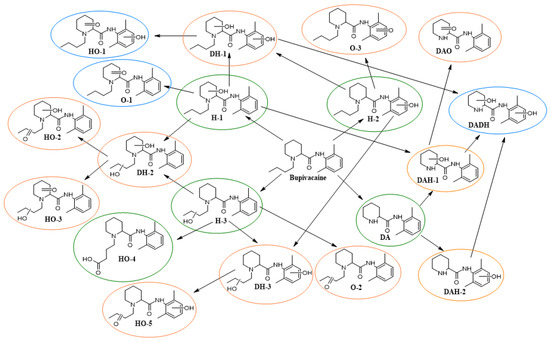 Bupivacaine metabolic pathways. The blue oval indicates undetected metabolites; the green oval indicates known metabolites found during the experiment; the orange oval indicates new previously unknown metabolites discovered during the experiment. Hydroxy- (H), dihydroxy- (DH), oxy- (O), hydroxy- with oxy- (HO), dealkylated with hydroxy- (DAH), dealkylated with oxy- (DAO).