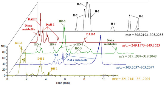 Recently, several methods were proposed for retention time prediction in LC [36,37,38,39,40,41]. However, to use most of them, a training dataset of retention time values for at least hundreds of molecules is needed to adjust the models for new separation conditions. Since such a dataset was unavailable in the current work [42], we used the machine learning-based predictor described in our previous work to get retention time values of detected metabolites in different separation conditions (Table S3). On the assumption that the retention order is preserved in both conditions, we attempted to annotate the metabolites based on these predicted retention time values. However, we found some contradictions between the experimental and calculated retention times. For example, we observed that two H-2 metabolites with RT 3.98 and 4.82 min were eluted earlier than the metabolite of H-3 class with RT 5.08 min. We then observed that one H-2 metabolite with RT 5.37 min and, after that, two H-3 metabolites with RT 7.51 and 7.92 min were eluted. From 9.50 to 10.40 min, three H-1 metabolites were detected (Figure 3, Table 1). However, predicted RT values follow a different elution order. For oxy-metabolites, the O-3 metabolite was eluted earlier than any of the O-2 metabolites, whereas the predicted RT values indicate later elution of O-3. These and other contradictions did not allow using this approach to annotate bupivacaine metabolites.