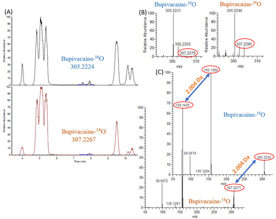 Bupivacaine was incubated in parallel under 2 conditions: A and B in Figure 6A and B, respectively. Experiments were carried out according to the standard protocol for in vitro drug metabolism stability with microsomes, described by Knigts et al. [5] and in more detail in this paper’s Supplementary Materials. In both cases, the incubation time was 1 h. To implement a better insertion of the isotope label in B (Figure 6B) before preparing solutions of microsomes, cofactors and reducing agent-NADPH, a 15 min degassing of the 50 mM phosphate buffered saline (PBS) in water was carried out. Degassing was performed at this stage, since the cytochromes P450 can be inactivated by sonication [43]. After that during the preincubation of hepatic microsomes with stocks, gaseous 18O2 was passed through the solution to displace 16O2. In order to compensate for excess pressure and carry out further injection of NADPH, a syringe needle was inserted into the lid of the vessel. Injection of NADPH followed by 18O2 passing through the solution was made. After 3 min, the needle was removed, and the hole was closed with parafilm to create an airtight vessel.