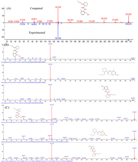 (A) A comparison between computed MS/MS spectrum and experimental for H-2 metabolite with RT 5.37 min. (B,C) Experimental and computed MS/MS spectrum for 5.37, 4.82 and 3.98 min (from top to bottom).