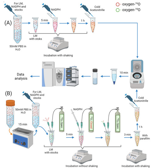 Stages of the microsomal stability experiment according to the standard protocol (A) and in the presence of 18O2 for labeling metabolites (B). LM—liver microsomes; PBS—phosphate buffered saline.