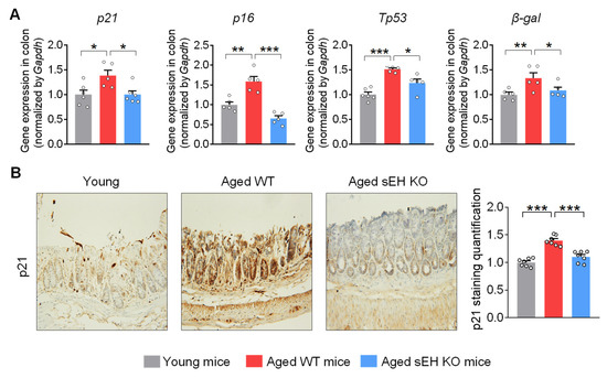 Having demonstrated the elevated sEH expression and activity in the colon, its potential functional role in the aging process was then studied in the colon by comparing the expression of cellular senescent markers in young wild-type male mice (3-month-old), aged wild-type male mice (20-month-old), and aged sEH genetic knockout male mice (Ephx2−/−) mice (20-month-old). The wild-type aged mice exhibit increased expression of multiple senescent markers, including p21, p16, Tp53, and β-galactosidase, in the colon compared to young mice (Figure 2A), which is consistent with previous human and animal studies showing the accumulation of the senescence regulators p21, p16, or p53, which are commonly used as biomarkers for colon aging [8,9]. Immunohistochemical analysis confirmed the increased colonic p21 protein level in older mice (Figure 2B). Interestingly, genetic ablation of sEH blocked the upregulation of senescent markers in older mice (Figure 2A,B), supporting a critical direct role of sEH in the age-related senescence program in the colon.