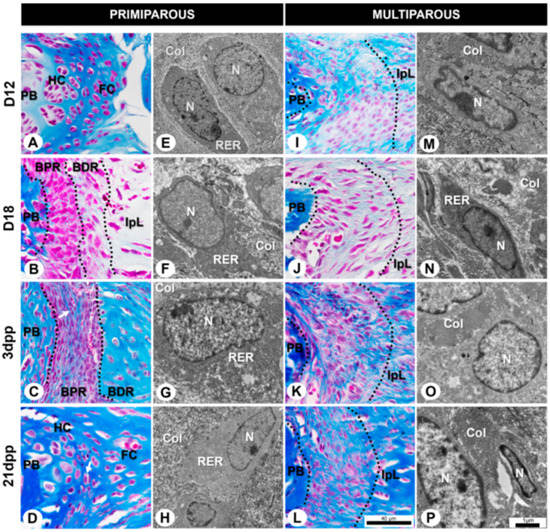 Representative cells and extracellular matrix (ECM) morphological aspects of symphyseal enthesis during pregnancy and postpartum in primiparous (A–H) and multiparous senescent (I-P) female mice at light and transmission electron microscopy. (A) At D12, pubic symphysis (PS) architecture is composed of the fibrocartilaginous disc (FC) between hyaline cartilage (HC). (B,C) At D18 and 3dpp, between pubic bones (PB) and interpubic ligament (IpL), see demarcated areas with dotted lines that approximately correspond to two distinct regions in the symphyseal enthesis: bone proximal region (BPR) with numerous oval cells next to each other and bone distal region (BDR) with elongated and sparse cells. (D) At 21dpp, the BPR and BDR of the enthesis are indistinguishable, and a similar non-pregnant joint morphology is restored. See the organization of cells around the PB and the isogenous groups (arrow). (I–L) Symphyseal enthesis of multiparous senescent mice with persistent IpL during pregnancy and postpartum. BDR and BPR are almost indistinguishable in demarcated areas with dotted lines. (E–H,M–P) Ultrastructure of symphyseal enthesis cell types and ECM aspects during pregnancy and postpartum in primiparous and multiparous senescent female mice. Observe the presence of a developed rough endoplasmic reticulum (RER) in the cytoplasm, nucleus (N), and collagen fiber (Col) arrangement. (A–D,I–L) Masson trichrome staining, scale bar = 40 μm. (E–H,M–P) Transmission electron microscopy, scale bar = 1 μm.