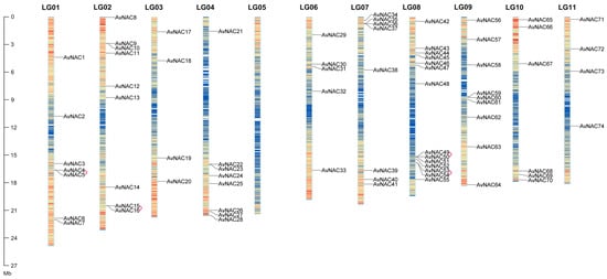 A total of 74 NAC TF members named AvNAC1–AvNAC74 according to their positions on the chromosomes were identified in A. venetum by the HMM search and complete domain analysis (Figure 1). AvNAC genes were unevenly distributed on chromosomes, with a high enrichment on chromosome 8 with 14 AvNAC members. Each of the A. venetum eleven chromosomes has at least three AvNAC members, reflecting its diversity and complexity, except for chromosome 5, which contained no AvNAC gene. The physicochemical properties of AvNAC genes are listed in Supplementary Table S1. The sequence length ranged from 164 to 688 amino acids with molecular weight from 19.36 to 76.26 kDa, and isoelectric point (pI) 4.39 to 9.58. Subcellular location prediction showed that sixty-four AvNAC proteins were nucleoprotein, eight members were cytoplasmic protein, and only one each in the chloroplast and cell membrane. These results suggested that AvNAC TFs might be involved in regulating the nuclear gene expression and have various functions to adapt to different environments.