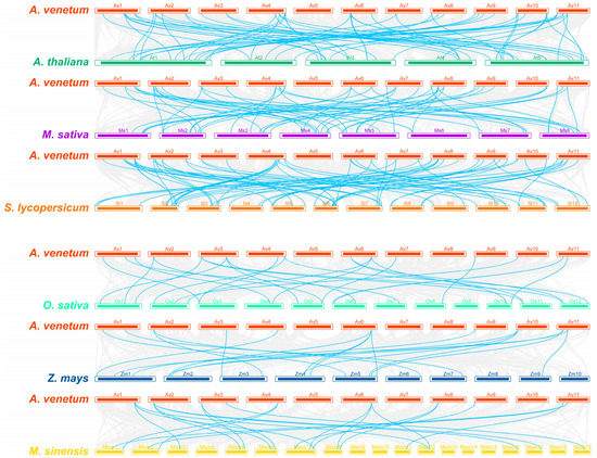 Synteny analysis of NAC genes between A. venetum and six other plant species (A. thaliana, M. sativa, S. lycopersicum, O. sativa, Z. mays and M. sinensis). The gray lines in the background represent collinear relationships between A. venetum and six other species, while the cyan lines highlight the syntenic NAC gene pairs.