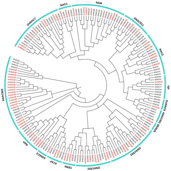 The phylogenetic tree of AvNAC proteins with AtNAC proteins in A. thaliana. The AvNACs are indicated by red color and italic, and the AtNACs are indicated by black color.