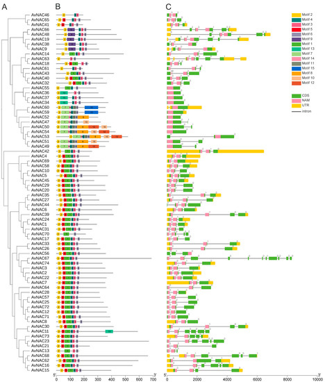 Phylogenetic tree, conserved motifs and gene structures of 74 AvNAC TFs. (A) Phylogenetic tree of 74 AvNAC TFs. (B) Conserved motifs in the 74 AvNAC proteins. Different colors represent different motifs. (C) Gene structures of AvNAC genes. Green and yellow boxes indicate the exons and untranslated regions (UTRs), and black lines indicate introns. Pink boxes highlight the NAM domains.
