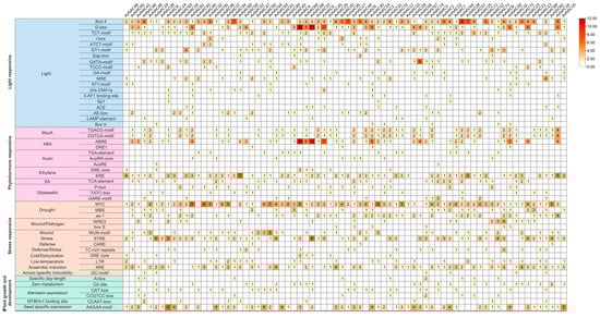 Analysis of cis-elements in AvNAC promoters. Statistics and categories of cis-elements in the promoter regions of AvNAC genes. The numbers of cis-acting element were indicated by numbers and a color gradient.