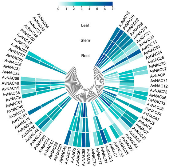 Expression patterns of AvNAC genes in different tissues (root, stem and leaf). Log2 (FPKM + 1) values are indicated by the shade of the color, with darker colors representing larger values.