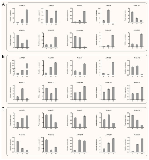 Relative expression of selected AvNAC genes in various tissues of A. venetum under drought stress (0, 5, 10, 20% PEG6000 treatment). (A) Leaf. (B) Stem. (C) Root.