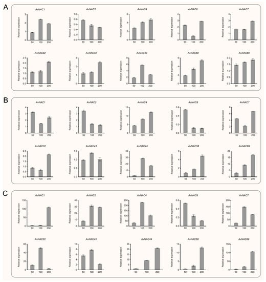 Relative expression of selected AvNAC genes in various tissues of A. venetum under salt stress (0, 50, 100, 200 mM NaCl treatment). (A) Leaf. (B) Stem. (C) Root.