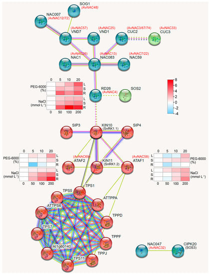 Prediction of protein–protein interaction was performed by the online program STRING v.11.5 (https://cn.string-db.org/, accessed on 23 November 2022) [65], using AvNAC proteins as the queries and the Arabidopsis proteins as references.