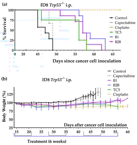 - Vasey, P.A.; McMahon, L.; Paul, J.; Reed, N.; Kaye, S.B. A phase II trial of capecitabine (Xeloda®) in recurrent ovarian cancer. Br. J. Cancer 2003, 89, 1843–1848. [Google Scholar] [CrossRef]