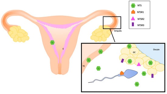 Several publications have reported the expressions of NTS and its receptors in reproductive tissues, related to their roles in reproduction functions, particularly in ovulation, sperm capacitation, fertilization, and embryonic development. It has recently been highlighted that NTS receptors are located on male gametes and that NTS is expressed in the uterus. NTS could play a role in reproduction issues by participating in follicular rupture during ovulation [,] and improving sperm capacitation and the acrosome reaction [,]. Moreover, after fertilization, NTS would improve the rate of embryonic cleavage and embryo quality in cattle and mice [,].