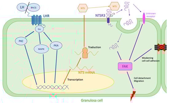 In order to demonstrate the role of the NTS/NTSR3 complex in ovulation, Campbell et al. inhibited NTS in vivo []. Over the monitored cycles, an intrafollicular injection of a rabbit antibody against NTS (ImmunoStar, Hudson) or control IgG was performed during aseptic surgery. Immediately postoperatively, hCG was administered to initiate ovulatory events. They showed that three out of four “anti-NTS-injected” follicles did not break without oocyte release and had an aspect of hemorrhagic cyst, whereas all the control ones showed a clear rupture of the membrane (four/four) []. The follicles injected with either the control IgG or the NTS antibody showed evidence of structural luteinization. In addition, both treatments resulted in similar levels of serum progesterone after hCG administration []. Finally, NTS stimulated ovarian microvascular endothelial cell migration in a dose-dependent manner but did not alter proliferation []. The mechanisms leading to follicular rupture through the interaction of NTS with NTSR3 are not known. However, it has been described in other models, notably in cancer, that the interaction of NTS with NTSR3 activates signaling cascades through focal adhesion kinase (FAK), a key pathway leading to the weakening of cell–cell and cell–extracellular matrix adhesions, a series of events that could be responsible for migration and cancer metastasis. Finally, some future approaches targeting NTSR3 release through the inhibition of matrix metalloproteinases (MMPs) are suggested [].