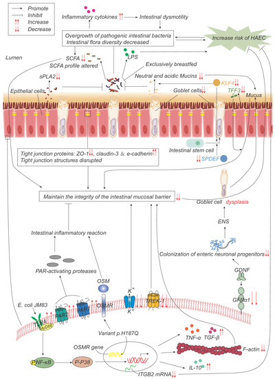 Pathogenesis advances in genes, intestinal microflora, and mucosal barrier. p.H187Q in the Oncostatin-M receptor (OSMR) gene is a susceptible variant of HAEC, which promotes inflammation by activating the OSM-OSMR axis. Decreased integrin beta-2 (ITGB2) mRNA expression is negatively correlated with the incidence and severity of HAEC. Overgrowth and reduced diversity of intestinal bacteria lead to increased release of inflammatory factors, which leads to intestinal dysmotility, which in turn leads to further bacterial overgrowth. Epithelial cells produce less secretory phospholipase A2 (sPLA2), which reduces the inhibition of bacteria and promotes bacterial overgrowth. Lipopolysaccharide (LPS) produced by bacteria can promote the development of HAEC, while exclusive breastfeeding regulates the gut microbiome in such a way that LPS production is reduced. Short-chain fatty acids (SCFAs) produced by bacteria are reduced, and their composition is altered, impairing the function of maintaining mucosal integrity. The expressions of TFF3, SPDEF, and KLF4 are significantly down-regulated, leading to the decrease in goblet cells (GCs) and the secretion of neutral and acidic mucins, which lead to the weakening of the mucosal barrier function. The expression of glial cell line-derived neurotrophic factor (GDNF) co-receptor and GDNF family receptor alpha-1 (GFRα1) is decreased, and the colonization of neuronal progenitor cells in the intestine is impaired, affecting ENS development, resulting in GCs dysplasia, and abnormal mucin production and storage. The structure of the tight-junction protein is damaged, and its composition is changed, which impairs its function of maintaining the mucosal barrier integrity. Escherichia coli JM83 stimulates NF-κB through TLR4 and MyD88, and through NF-κB/p-p38 signal transduction, F-actin protein density is significantly reduced, IL-10, TNF-α, TGF-β increase, leading to intestinal mucosal damage and promoting the development of HAEC. TREK-1 and K(ATP) channels are reduced, leading to barrier dysfunction. Increased expressions of PAR-1 and PAR-2 lead to excessive local release of PAR-activating protease, which leads to inflammatory responses and impairs barrier function.