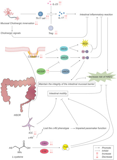 Pathogenesis advances in ENS. With a low cholinergic innervation degree in colon mucosa, Th17 cells and Treg cells regulate intestinal inflammatory response through the production of IL-17 and IL-23, promoting the development of HAEC. The decreased expression of caveolin-1 (Cav-1) results in the overactivation of inducible NO synthase (iNOS), which produces NO to promote inflammatory response while decreasing the inhibition of endothelial NOS (eNOS) on inflammatory response. The increased expression of NOS interacting protein (NOSIP) promotes inflammatory response and destroys the mucosal barrier by inhibiting NO production of neuronal NOS (nNOS) and eNOS. Interstitial cells of Cajal (ICCs) lose the c-Kit phenotype, resulting in impaired pacemaker function and intestinal motility. Cystathionine-β-synthase (CBS) and cystathionine-γ-lyase (CSE) are two key enzymes in the synthesis of hydrogen sulfide from L-cysteine. The decreased expression of CBS and CSE reduces gastrointestinal peristalsis and promotes the inflammatory response.