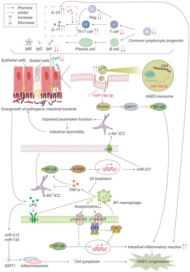 Pathogenesis advances in immunity. The number of common lymphocyte progenitor populations and, therefore, T cells and B cells decrease significantly, resulting in reduced immunoglobulin, which is actively transported to the mucosal surface by polymerized immunoglobulin receptors (pIgR) in the form of dimers to maintain the intestinal microenvironment balance and normal function. pIgR is also reduced, which together leads to intestinal microenvironment disturbances and bacterial overgrowth. Increased Th17 cells produce more IL-17 and promote the intestinal inflammatory response. On one hand, LPS produced by bacteria activates M1 macrophages through the TLR4 pathway, and M1 macrophages produce TNF-α, which inhibits c-Kit expression in ICC through the NF-κB/miR-221 pathway, leading to intestinal motility disorders, which further leads to the accumulation and overgrowth of intestinal bacteria. 4-octyl itaconate (OI) reduces the production of proinflammatory factors and promotes ICC phenotypic recovery by inhibiting macrophage activation. LPS, on the other hand, induces the up-regulation of miR-132/-212, activates inflammasome NOD-, LRR-, and pyrin domain-containing protein 3 (NLRP3) by inhibiting the expression of sirtuin 1 (Sirt1), promotes cell pyroptosis, and then promotes the occurrence and development of HAEC. Acetylcholine acts on α7 nicotinic acetylcholine receptor (α7nAChR) on the surface of macrophages, inhibits the activation of macrophages, activates the anti-inflammatory pathway of JAK2-STAT3 and suppresses the inflammatory pathway of NF-κB. Acetylcholine in HAEC is reduced, and the above anti-inflammatory effects are weakened. Exosome miR-18a-5p down-regulates RAR-related orphan receptor A (RORA), activates the SIRT1/NF-κB signaling pathway, induces excessive inflammatory response, and thus promotes the development of HAEC.