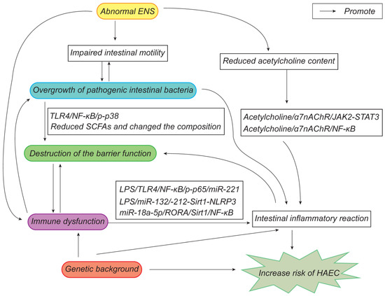 The abnormal ENS of HSCR leads to impaired intestinal motility, resulting in functional obstruction with subsequent stasis and overgrowth of pathogenic intestinal bacteria, destruction of the mucosal layer, invasion of the intestinal wall, dysfunction of the intestinal mucosal barrier, impaired immune response and consequent HAEC. This abnormal neurological function is considered to be an important cause of preoperative HAEC episodes.