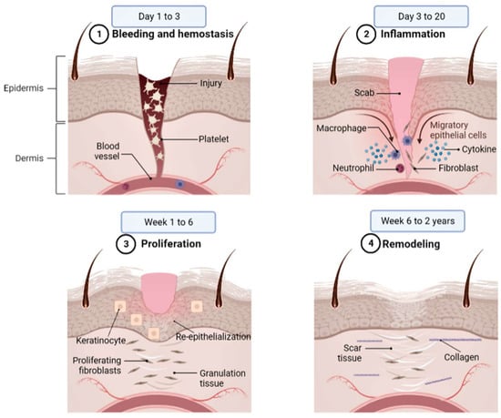 Wound healing is a multi-phased process that occurs when the normal anatomical structure and function of skin tissues are disrupted. Inflammation, granulation, wound shrinking, collagen creation, epithelial closure, and scar formation are all part of the process. The smoothness of these phases promotes wound healing and restores the skin’s previously compromised anatomical condition and function [16]. Wound healing is a four-phase process that involves a complicated series of reactions and interactions between cells and mediators; these phases are hemostasis, inflammation (0–3 days), proliferation (3–24 days), and maturity (24 to 365 days). Figure 1 depicts the physiological wound-healing phases. These phases and their physiological functions must occur in the correct order, at a specified moment, and at an optimal intensity for a specific length. In the first phase (bleeding and hemostasis), hemostasis occurs immediately after bleeding and reduces blood flow by constricting blood vessels to stop bleeding following vascular injury. The phenomenon that subsequently occurs is the aggregation of platelets, degranulation, and the production of fibrin, which is also known as thrombus.