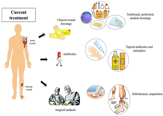 On the other hand, acute wounds are associated with the external destruction of intact skin and are composed mainly of burns, cuts, and bites, as well as traumatic lacerations [36]. The treatment regime depends on the type, severity, and size of the wounds. Similar to chronic wounds, acute wounds are also susceptible to microbial infections, with an estimated microbial colonization of 5 to 26% [37]. Burn wound infections encompass more than half of mortalities per year, and a number of pathogenic microbes such as S. aureus, P. aeruginosa, and Escherichia coli, as well as coagulase-negative Staphylococci, have been identified in post-burn injuries [38]. Of all, there are no current effective treatments for both wounds in terms of side effects and cost effectiveness. Figure 2 illustrates the current treatment utilized for treating acute and chronic wounds. Thus, in this section, current treatments available in wound healing are thoroughly discussed.