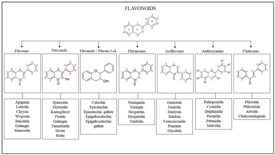 Flavonoids are generally recognized as the most common bioactive compounds on the planet. Flavonoids are abundant in fruits and vegetables. Flavonoids are phenolic compounds that can be found in fruits, vegetables, herbs, cocoa, chocolate, tea, soy, red wine, and other plant food and beverage products. Flavonoids are composed of two aromatic rings (A and B rings) connected by a three-carbon chain to produce an oxygenated heterocyclic ring (C ring). Based on changes in the general structure of the C ring, functional groups on the rings, and the position at which the B ring is linked to the C ring, flavonoids can be classified into various classes such as flavones, flavonols, flavanols, flavanones, isoflavones, anthocyanins, and chalcones. Figure 3 represents the basic skeletal structure of flavonoids and their classes as well as the examples. Individual compounds within each category are distinguished by distinct hydroxylation and conjugation patterns [68,69,70]. Flavonoids are one of the most attractive and promising families of natural products for treating skin problems. The structure–activity connection (SAR) of flavonoids is one of the key elements that lead to this feature. The presence of hydroxyl groups in their chemical structure, particularly at positions 5, 7, 3, and 4, is critical for their antibacterial, antifibrotic, antioxidant, and anti-inflammatory effects due to their high hydroxylation levels [61].