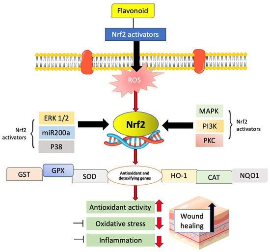 Potential mechanisms that Nrf2 activation affects wound healing. Flavonoids act as the Nrf2 activators that activate the ERK1/2, p38MAPK, PI3K, and PKC signaling pathways. Extracellular signal-regulated protein kinases 1 and 2 (ERK1/2), mitogen-activated protein kinases (MAPK), phosphoinositide 3-kinase (PI3K) and protein kinase C (PKC), glutathione S-transferase (GST), glutathione peroxidase 1 (GPX), superoxide dismutase type (SOD), heme oxygenase-1 (HO-1), catalase (CAT), and NAD(P)H quinone dehydrogenase 1 (NQO1).