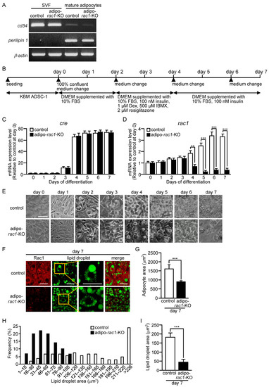 We established an in vitro differentiation assay as a first step to clarify the mechanisms for atrophy of WAT observed in adipo-rac1-KO mice [13]. Collagenase-treated mouse subcutaneous WAT was centrifuged and mature adipocytes as floating cells were removed. We then confirmed that the precipitated stromal vascular fraction (SVF) contained CD34-positive adipose progenitor cells, but not perilipin 1-positive mature adipocytes, by reverse-transcriptase polymerase chain reaction (RT-PCR) analysis [26,27] (Figure 1A).