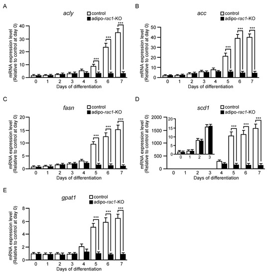 We previously demonstrated that mRNA levels of various enzymes for de novo synthesis of fatty acids and triacylglycerol, such as ACLY, ACC, FASN, SCD1, and GPAT1, were significantly lowered in subcutaneous WAT in adipo-rac1-KO mice [13]. These results suggest that Rac1 is responsible for the regulation of de novo lipid synthesis [13]. To further explore this possibility, we next assessed expression levels of the above enzymes during adipogenic differentiation in vitro. In the control cell culture, the expression of the genes that encode the above enzymes was highly stimulated during adipogenic differentiation (Figure 2). The increase in the expression level of the gene encoding ACLY was observed at day 5, followed by further increase until day 7 (Figure 2A). Likewise, expression levels of genes encoding ACC, FASN and GPAT1 started to increase at day 5, and continued to increase up to the maximal level around day 6 (Figure 2B,C,E). The expression level of the scd1 gene was increased after day 2, and reached a maximum at day 5 (Figure 2D). In marked contrast, virtually no increase in expression levels of all of the above genes was detected in cells derived from adipo-rac1-KO mice (Figure 2). These results provide evidence that Rac1 is intimately involved in the induction of genes that encode enzymes for de novo synthesis of fatty acids and triacylglycerol during adipogenic differentiation. The expression of the scd1 gene was increased until day 3 not only in control cells but also in cells from adipo-rac1-KO mice, because the rac1 gene was not disrupted at this time point (Figure 2D).