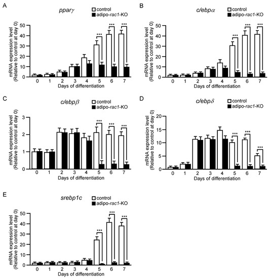 Another family of transcription factors, the C/EBP family, is composed of six members, in which the basic leucine zipper (bZIP) domain is conserved at the C terminus [25]. Among them, C/EBPα has been implicated in the control of differentiation into adipocytes through the induction of diverse target genes. The mRNA level of C/EBPα in control cells was increased as adipogenic differentiation proceeded, whereas no induction was observed after day 4 in cells isolated from adipo-rac1-KO mice, similarly to the case of PPARγ (Figure 3B). The expression of genes for C/EBPβ and C/EBPδ isoforms is known to be promoted in the early stage of adipogenic differentiation, and these two isoforms are involved in the induction of PPARγ and C/EBPα [25]. C/EBPβ and C/EBPδ mRNAs were increased to near-maximal levels within two days in cells from both control and adipo-rac1-KO mice (Figure 3C,D). Expression levels of C/EBPβ and C/EBPδ in cells from adipo-rac1-KO mice were largely decreased after 5-day induction of differentiation, in contrast to control cells, in which the expression levels were sustained (Figure 3C,D).