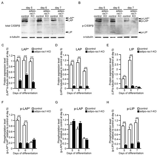 Protein and phosphorylation levels of three C/EBPβ variants in the late stage of differentiation of adipose progenitor cells into adipocytes in vitro. Protein (A) and phosphorylation (B) levels of three C/EBPβ variants (LAP*, LAP, and LIP) in cells derived from control and adipo-rac1-KO mice were determined by immunoblot analysis using antibodies against C/EBPβ (A) and phosphorylated C/EBPβ (B), respectively. α-tubulin served as a loading control. Intensities of bands for LAP* (C), LAP (D), LIP (E), phosphorylated LAP* (p-LAP*) (F), phosphorylated LAP (p-LAP) (G), and phosphorylated LIP (p-LIP) (H) in immunoblots were quantified. Data are shown as means ± S.E. (n = 3). ** p < 0.01, *** p < 0.001 (Student’s t test).