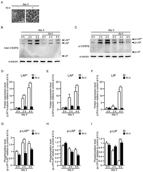 Protein and phosphorylation levels of three C/EBPβ variants in the early stage of differentiation of adipose progenitor cells into adipocytes in vitro. (A) Phase-contrast images of cells derived from control mice in the presence or absence of RI-II at day 2. Scale bar, 50 μm. Protein (B) and phosphorylation (C) levels of three C/EBPβ variants (LAP*, LAP, and LIP) in cells derived from control mice in the presence or absence of RI-II were determined by immunoblot analysis using antibodies against C/EBPβ (B) and phosphorylated C/EBPβ (C), respectively. α-tubulin served as a loading control. Intensities of bands for LAP* (D), LAP (E), LIP (F), p-LAP* (G), p-LAP (H), and p-LIP (I) in immunoblots were quantified. Data are shown as means ± S.E. (n = 3). ** p < 0.01, *** p < 0.001 (Student’s t test).