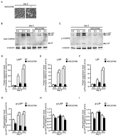 Protein and phosphorylation levels of three C/EBPβ variants in the early stage of differentiation of adipose progenitor cells into adipocytes in vitro. (A) Phase-contrast images of cells derived from control mice in the presence or absence of NSC23766 at day 2. Scale bar, 50 μm. Protein (B) and phosphorylation (C) levels of three C/EBPβ variants (LAP*, LAP, and LIP) in cells derived from control mice in the presence or absence of NSC23766 were determined by immunoblot analysis using antibodies against C/EBPβ (B) and phosphorylated C/EBPβ (C), respectively. α-tubulin served as a loading control. Intensities of bands for LAP* (D), LAP (E), LIP (F), p-LAP* (G), p-LAP (H), and p-LIP (I) in immunoblots were quantified. Data are shown as means ± S.E. (n = 3). ** p < 0.01, *** p < 0.001 (Student’s t test).
