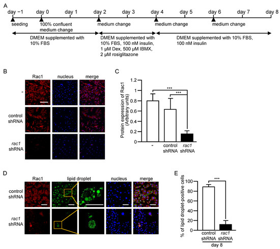 To further confirm that Rac1 plays an important role in adipogenic differentiation, we next examined the effect of Rac1 knockdown in another in vitro differentiation system using the 3T3-L1 preadipocyte line. Adipogenic differentiation of 3T3-L1 cells was induced according to a standard protocol as described previously [11,12] (Figure 7A). The day when cells reached confluence was referred to as day 0. Confluent cells were further cultured for two days in DMEM-based growth medium. At day 2, reagents, such as insulin, were added to the culture medium, inducing adipogenic differentiation (Figure 7A).