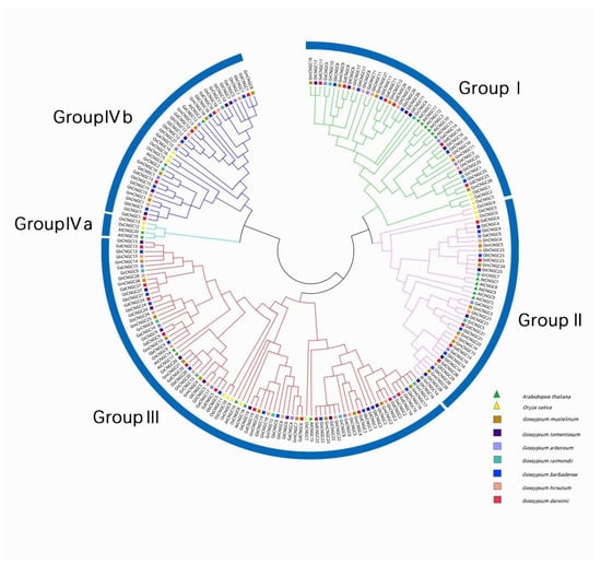 In order to investigate the genetic evolutionary relationship of CNGCs, a neighbor-joining tree was constructed using the maximum likelihood (ML) method with a total of 209 CNGC proteins, including 20 from Arabidopsis [15], 16 from rice [16] and 173 from Gossypium species. (Figure 1). As a result, these CNGCs were unevenly classified into four groups, and group IV was further divided into subgroup IVa and subgroup IVb. Group I included four GaCNGCs, six GbCNGCs, six GdCNGCs, six GhCNGCs, six GmCNGCs, three GrCNGCs, six GtCNGCs, six AtCNGCs and three OsCNGCs. Group II included three GaCNGCs, four GbCNGCs, five GdCNGCs, five GhCNGCs, six GmCNGCs, three GrCNGCs, five GtCNGCs, five AtCNGCs and three OsCNGCs. Group III contained 6 GaCNGCs, 12 GbCNGCs, 12 GdCNGCs, 12 GhCNGCs, 12 GmCNGCs, 6 GrCNGCs, 12 GtCNGCs, 5 AtCNGCs and 5 OsCNGCs. Group III has 82 CNGCs, which is the largest branch of the four CNGC groups. Group IVb contained four GaCNGCs, five GbCNGCs, five GdCNGCs, six GhCNGCs, five GmCNGCs, two GrCNGCs, five GtCNGCs, two AtCNGCs and three OsCNGCs. However, no CNGCs from Gossypium were contained in group IVa, indicating the peculiarity of cotton species.