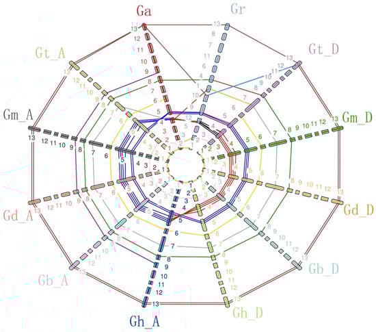 Analysis of Gossypium CNGCs for synteny. Ga: G. arboreum, Gr: G. raimondii, Gt_D: G. tomentosum Dt subgenome, Gm_D: G. mustelinum Dt subgenome, Gd_D: G. darwinii Dt subgenome, Gb_D: G. barbadense Dt subgenome, Gh_D: G. hirsutum Dt subgenome, Gh_A: G. hirsutum At subgenome, Gb_A: G. barbadense At subgenome, Gd_A: G. darwinii At subgenome, Gm_A: G. mustelinum Dt subgenome, Gt_A: G. tomentosum Dt subgenome. 1–13 represent Chromosome1 to Chromosome13, and different colors represent different chromosomes.