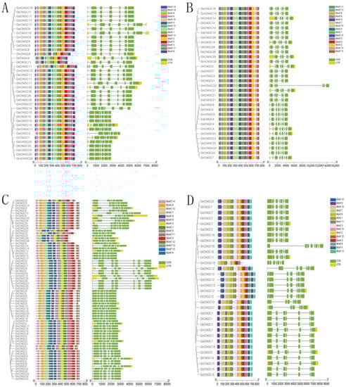 Phylogenetically aligned conserved motifs and gene structure analysis of CNGC genes in seven Gossypium species. (A) Group I; (B) group II; (C) group III; (D) group IVb.