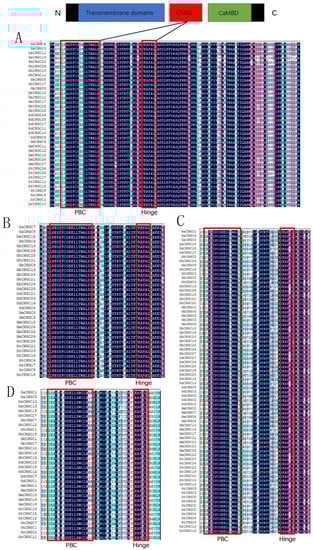 Multiple alignments of CNGC proteins in cotton. (A) Group I; (B) group II; (C) group III; (D) group IVb.